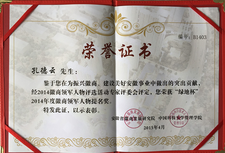 熱烈祝賀集團(tuán)董事長(zhǎng)孔德云榮獲14年徽商領(lǐng)軍人物提名獎(jiǎng)