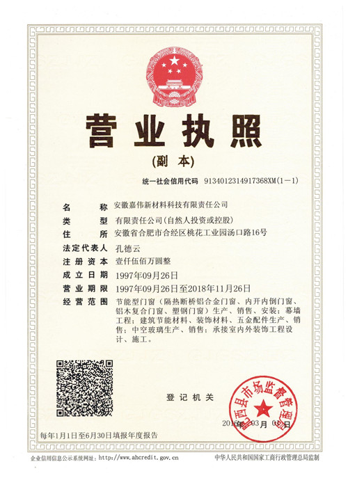 合肥嘉偉裝飾工程有限責(zé)任公司,成立于1997年9月26日,成立之初,公司致力于工程市場(chǎng)建筑門窗的生產(chǎn)與安裝,憑借其專業(yè)的技術(shù),優(yōu)質(zhì)的質(zhì)量,貼心的服務(wù),完美的售后,得到了客戶的高度贊賞。 發(fā)展不停步,創(chuàng)新無止境,經(jīng)過多年的奮斗,公司現(xiàn)已從一家單一從事建筑門窗生產(chǎn)與安裝的公司轉(zhuǎn)型升級(jí)發(fā)展成為集節(jié)能環(huán)保材料研發(fā)與生產(chǎn)、中高端節(jié)能智能型建筑門窗生產(chǎn)與安裝、節(jié)能型玻璃幕墻生產(chǎn)與安裝為一體的高新技術(shù)企業(yè)。市場(chǎng)范圍擴(kuò)大至民用和海外兩個(gè)市場(chǎng),工程市場(chǎng)招展至華東地區(qū)的上海、杭州、南京,華中地區(qū)的武漢、長(zhǎng)沙等全國(guó)一二線城市。 為了順應(yīng)公司轉(zhuǎn)型升級(jí)的需要,更好的展現(xiàn)公司的市場(chǎng)形象,不斷成長(zhǎng)的價(jià)值,令公司得以更好的發(fā)展,經(jīng)過慎重的考慮,2016年3月1日,合肥嘉偉裝飾工程有限責(zé)任公司正式更名為安徽嘉偉新材料科技有限責(zé)任公司。