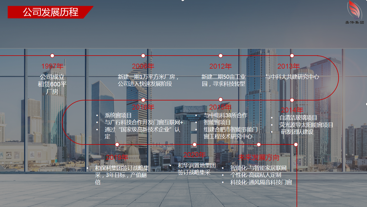 科技創(chuàng)新、產(chǎn)品升級(jí) 歷經(jīng)23年的奮斗,公司現(xiàn)已發(fā)展成為集傳統(tǒng)建筑門窗與智能門窗、節(jié)能門窗、超靜音門窗等高科技門窗產(chǎn)品研發(fā)、生產(chǎn)、安裝于一體的國(guó)家級(jí)高新技術(shù)企業(yè)。已獲得了70多項(xiàng)智能節(jié)能門窗產(chǎn)品的發(fā)明專利、實(shí)用新型專利。公司積極對(duì)接中電科38所智能傳感研究中心智能傳感研發(fā)團(tuán)隊(duì)進(jìn)行門窗智能傳感產(chǎn)品研發(fā),進(jìn)一步加強(qiáng)和落實(shí)科技研發(fā)。并積極與中國(guó)科技大學(xué)、安徽建筑大學(xué)進(jìn)行產(chǎn)學(xué)研合作,共同研發(fā)通風(fēng)隔聲窗等科技門窗產(chǎn)品,為節(jié)能環(huán);菝褙暙I(xiàn)自己的一份力量。近年來(lái)受國(guó)內(nèi)國(guó)際環(huán)境和新冠病毒疫情影響,國(guó)家宏觀經(jīng)濟(jì)繼續(xù)趨于下行,各行業(yè)都面臨一定的考驗(yàn)和困難,嘉偉公司在董事會(huì)的正確領(lǐng)導(dǎo)下、在公司全體員工的努力下,憑借著卓越的產(chǎn)品品質(zhì)和服務(wù),2019年公司成為央企“保利發(fā)展”鋁合金門窗戰(zhàn)略合作伙伴(2019~2021),2020年8月公司喜中華潤(rùn)置地華中大區(qū)鋁合金門窗集采工程、華潤(rùn)置地華中大區(qū)2020年度塑鋼門窗集中采購(gòu)工程兩個(gè)標(biāo)段!