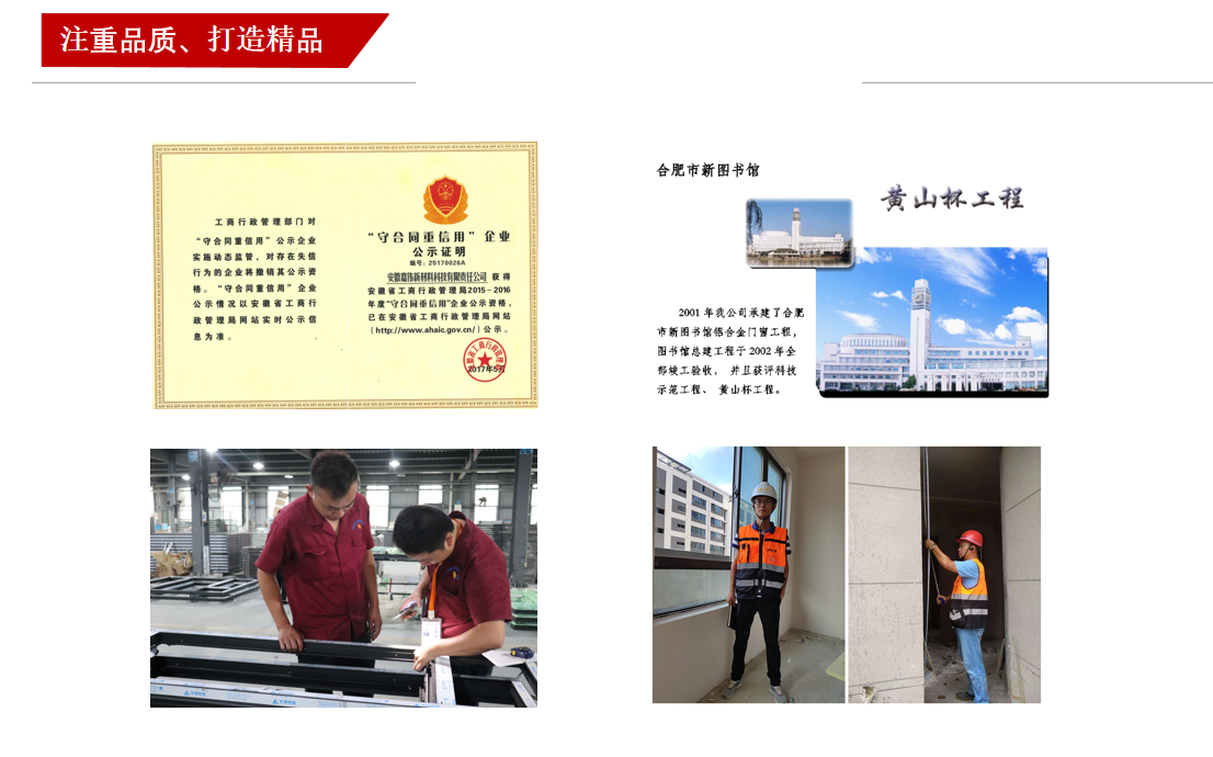 匠心制造 追求卓越 23年來(lái),我們堅(jiān)持“匠心制造、追求卓越”,打造一個(gè)又一個(gè)精品工程,為客戶創(chuàng)造最大價(jià)值是我們不懈的追求,滿足客戶不斷提出的需求是我們的服務(wù)之本。2001年我司參建的合肥市新圖書館鋁合金門窗工程榮獲科技示范工程、黃山杯工程;2017年我司參建的安徽省城鄉(xiāng)建設(shè)規(guī)劃大廈工程榮獲中國(guó)建設(shè)工程“魯班獎(jiǎng)(國(guó)家優(yōu)秀工程)”。日后,嘉偉將一如既往的注重品質(zhì),精益求精,打造滿意工程、精品工程,為客戶提供更優(yōu)質(zhì)的服務(wù)。