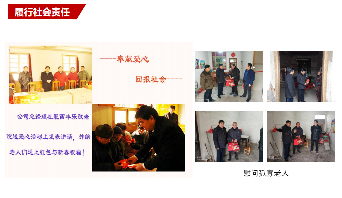 "飲水思源,富而思進(jìn)",企業(yè)自身不僅要不斷發(fā)展壯大,還要主動(dòng)承擔(dān)社會(huì)責(zé)任。公司董事長(zhǎng)秉承“奉獻(xiàn)愛(ài)心、回報(bào)社會(huì)”的理念,致力于社會(huì)慈善和公益事業(yè),主動(dòng)地承擔(dān)起相應(yīng)的社會(huì)責(zé)任和義務(wù),在賑災(zāi)扶貧、文化教育、新農(nóng)村建設(shè)等多個(gè)領(lǐng)域推動(dòng)公益事業(yè)發(fā)展,用愛(ài)心和善行來(lái)提升企業(yè)的社會(huì)價(jià)值,用實(shí)際行動(dòng)來(lái)回報(bào)社會(huì)。嘉偉以自身善舉凝聚愛(ài)心,踐行社會(huì)責(zé)任,回報(bào)社會(huì),把公益作為一項(xiàng)事業(yè),讓慈善成為永恒。2019年公司獲得肥西縣首屆“愛(ài)心企業(yè)”榮譽(yù)稱號(hào)。