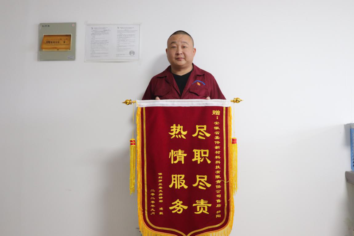 11月5日,安徽嘉偉新材料科技有限責(zé)任公司售后部主管楊陽收到保利羅蘭春天房修部主管李信送來的錦旗——“盡職盡責(zé)/熱情服務(wù)”,公司常務(wù)副總經(jīng)理許平給予了熱情接待。