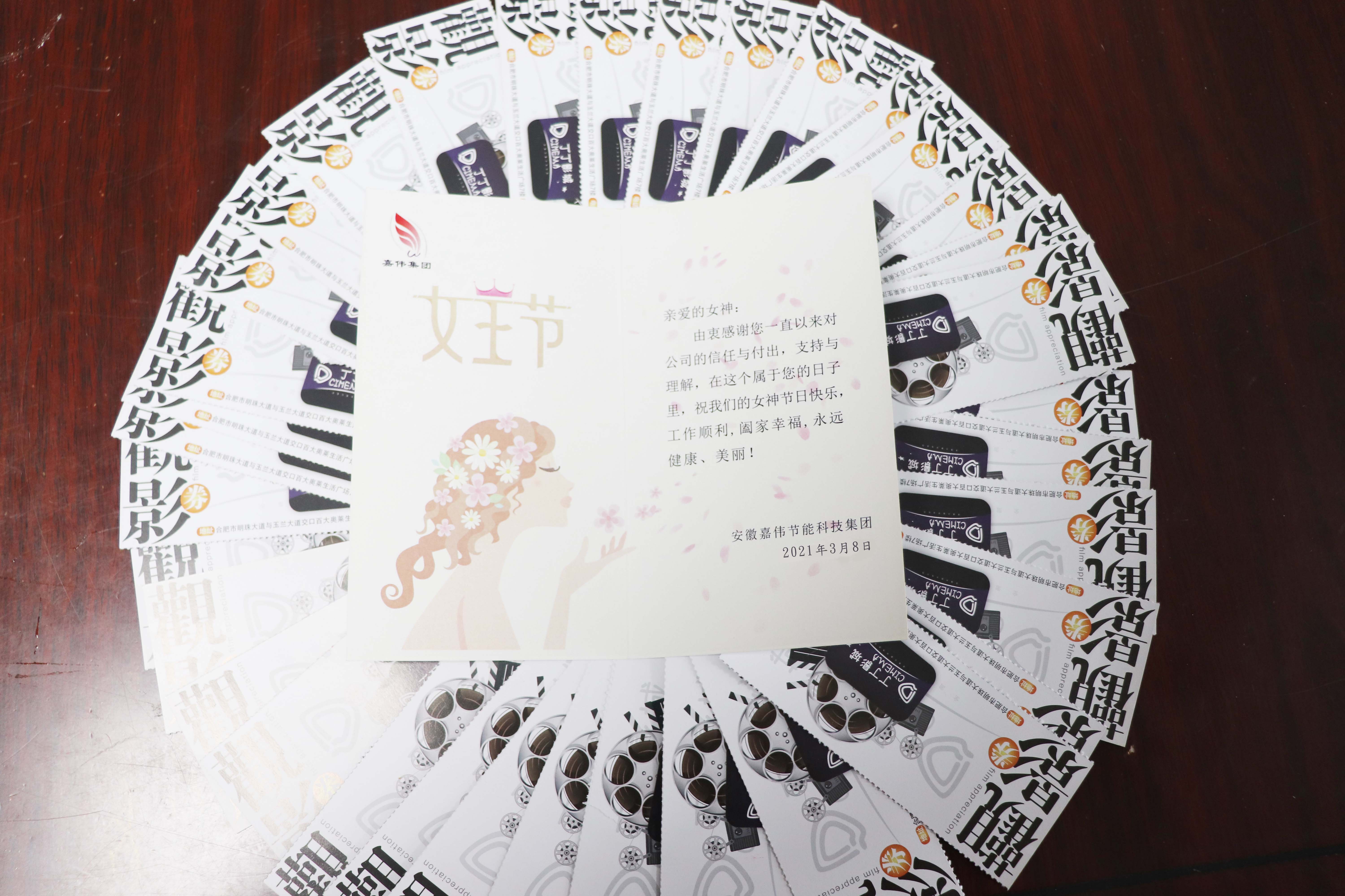 左手工作,右手生活,可以天生麗質(zhì),也可以天生勵志!世界因你們而美麗,生命因你們而完美。安徽嘉偉新材料科技有限責任公司為每一位“女神”準備了三八節(jié)禮物(觀影券),希望你們在工作的同時也可以盡情的享受生活!